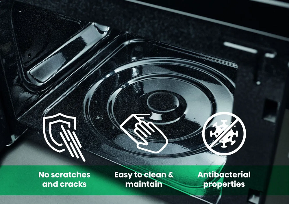 Внутренняя поверхность микроволновой печи Hisense имеет керамическое покрытие, которое отличается рядом преимуществ. Такая прочная поверхность никогда не царапается и не трескается, не начинает липнуть после нагревания пищи. Она приятна на ощупь, легко моется и придает изделию элитный вид. Кроме того, это покрытие обладает антибактериальными свойствами, которые предотвращают действия бактерий.