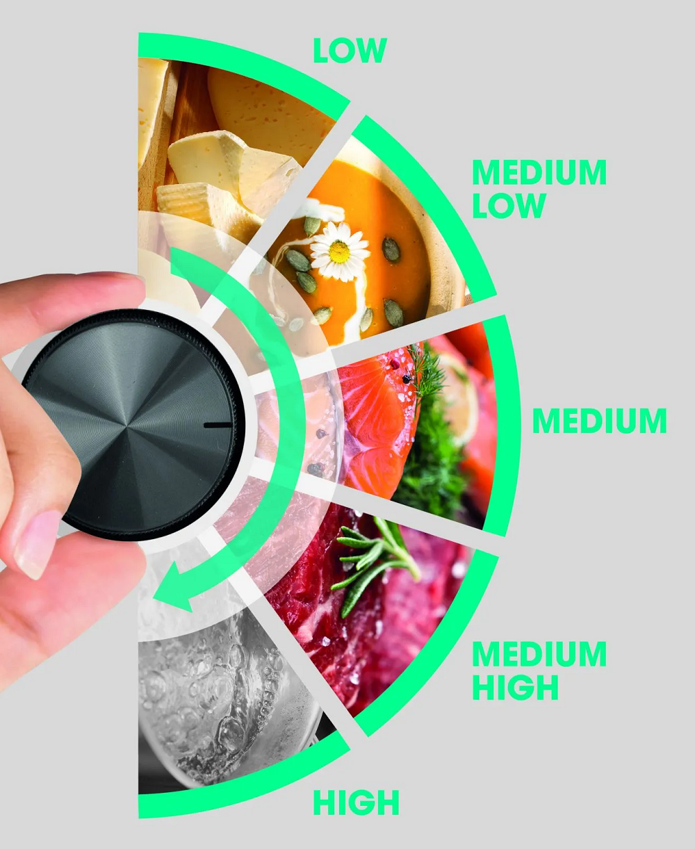 Выбирайте уровень мощности в соответствии с потребностями готовки. Высокая мощность пригодится, когда нужно нагреть что-то как можно быстрее. Например, если надо скипятить воду или приготовить прозрачный суп, уместной будет наибольшая мощность. Умеренно высокая мощность позволяет жарить или готовить на пару, а низкая подходит для приготовления крем-супа или для использования прибора в режиме сушилки.